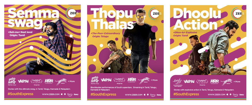 The campaign highlights these specific nuances using colloquial and popular lingo across South Indian languages, such as ‘Dhulu Action’ (translating to ‘next level of action’ in Telugu), ‘Semma Swag’ (‘awesome’ in Tamil), ‘Thopu Thalas’ (‘extraordinary superstars’ in Telugu+Tamil), and more. The use of these terms establishes our deep connection with South Indian content.